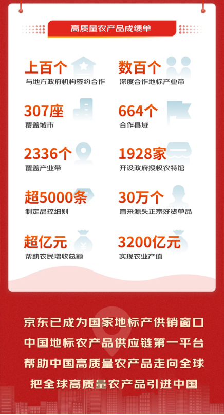 自京东开展“千县名品国家地标产业带”项目,截至目前,已经与地方政府、农村合作社、龙头企业携手,合作了全国2336个产业带,深度合作地标产业带数百个,与上百个产业带的政府及机构签约合作,覆盖源头直采正宗好货超30万个单品,累计开设中国县市政府授权的农特馆1928家,覆盖307座城市,664个县域,针对不同产品制定超5000条品控细则。