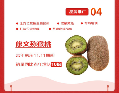 据了解,修文猕猴桃作为地标产业带,农产品上行乏力,名气走不出省,品牌发展遇到相当大的阻力。2021年贵州省与京东达成战略合作,京东给予修文县政府全方位资源倾斜,尤其是修文猕猴桃公域品牌及高端品牌在品牌推广侧的支持,不仅给予京东站内外流量、市场品牌营销侧全方位资源的倾斜,同时在政策减免、专项培训等方面进行支持,推动修文猕猴桃产业升级发展,有效提升修文猕猴桃产品的知名度和竞争力。去年京东11.11期间,修文猕猴桃销量同比去年增长10倍。
