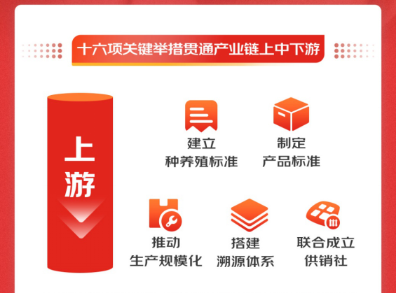 在产业链上游,京东推出五大举措:从建立种养殖标准、制定产品标准、推动生产规模化、搭建溯源体系、联合成立供销社助力产业发展。
