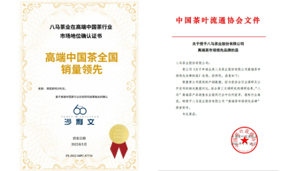 八马茶业获权威机构认证为“高端中国茶全国销量领先”(左)及“高端茶市场领先品牌”(右)