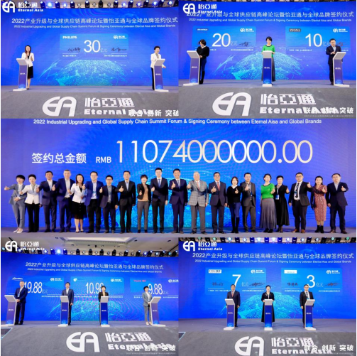 本次峰会现场,怡亚通与飞利浦、荷兰皇家菲仕兰、达能纽迪希亚、惠氏、研华科技、杰尼亚、福肯科技、堃博医疗等合作品牌企业采购签约,涉及大消费、医疗、工控等行业,签约总金额达110.74亿元人民币,创下了怡亚通历届参会最高签约记录。