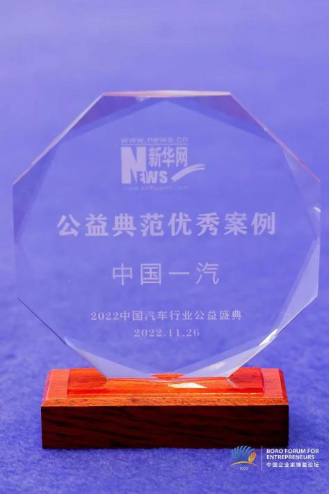 11月25日-11月28日,“2022中国企业家博鳌论坛”在海南博鳌举办。论坛期间,中国第一汽车集团有限公司(以下简称中国一汽)在“2022中国汽车行业公益盛典”上,入选“2022年度汽车行业公益典范优秀案例”。