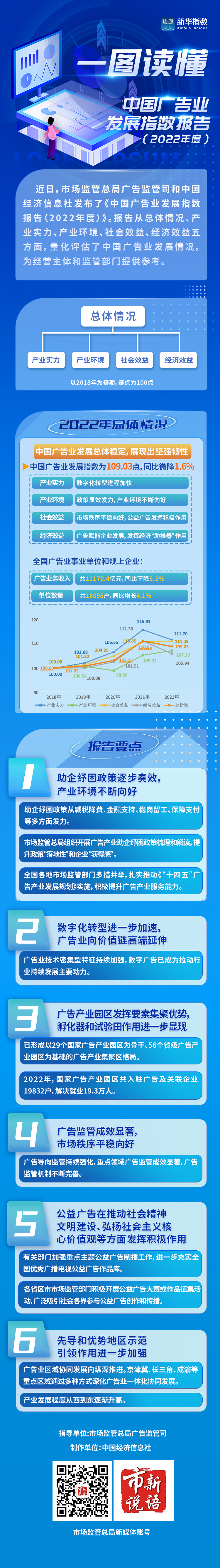 《中国广告业发展指数报告(2022年度)》于6月30日在京发布。报告显示,2022年中国广告业发展总体稳定,韧性显现。该报告由市场监管总局广告监管司和新华社中国经济信息社共同编制并发布,从总体情况、产业实力、产业环境、社会效益、经济效益五方面量化评估了中国广告业发展情况,为经营主体和监管部门提供参考。