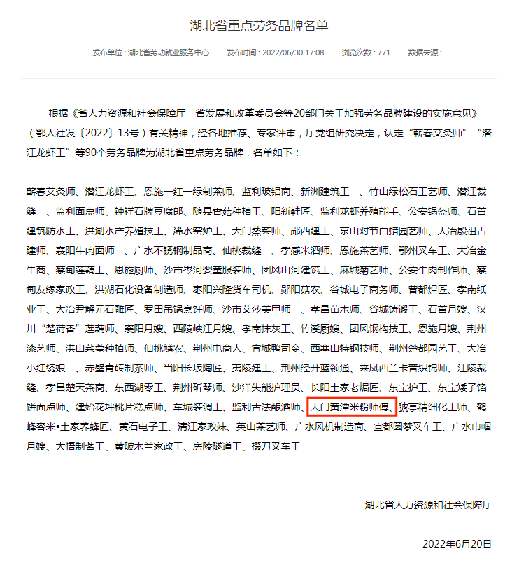 2022年6月20日“天门黄潭米粉师傅”被认定为湖北省重点劳务品牌;