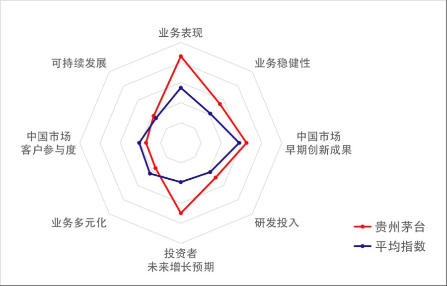 以上所有指标之中,在业务多元化(位列第11位)与中国市场的客户参与度(位列第16位), 贵州茅台均低于平均指数,尚有一定提升空间,这两项恰恰也是其近期在中国市场十分活跃的领域。