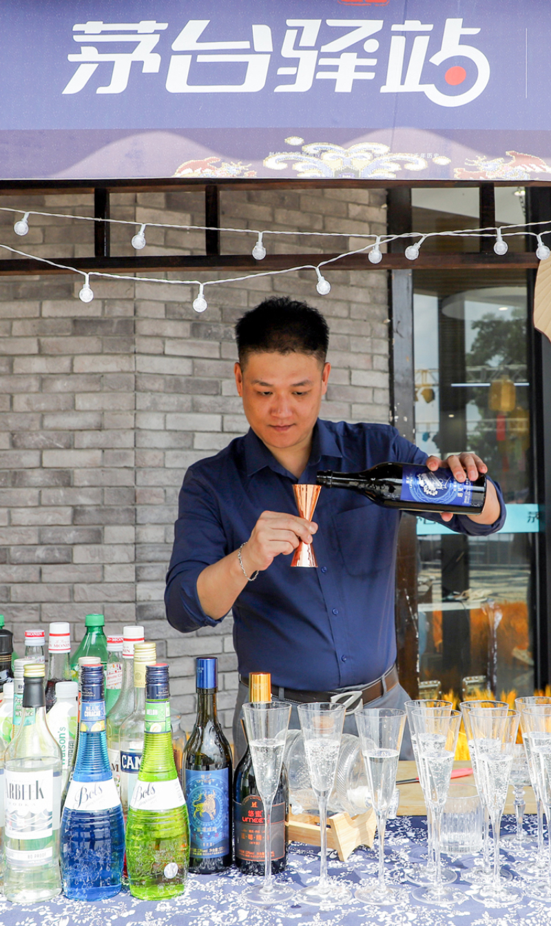 左手拿起酒瓶,慢慢倒入右手的调酒杯……调酒师认真地制作着酱香鸡尾酒。而这一杯酱香鸡尾酒,也开启了游客们在青岩古镇的梦幻夜游之旅。数据显示,双节期间,青岩古镇上的茅台驿站日均销售额近3万元。