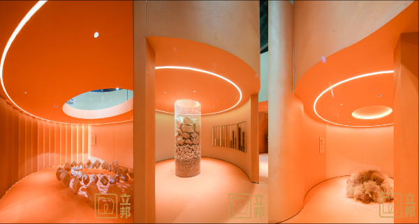 展览空间巧妙融入水、光、风等自然元素,展现立邦魔术漆取质自然的肌理效果