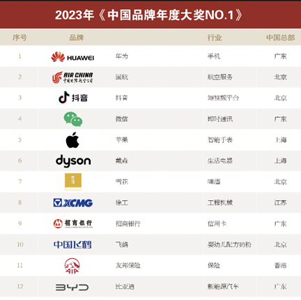 12月19日,2023年“中国品牌年度大奖”评选在“世界经理人峰会”上揭晓。该奖项由世界品牌实验室在香港颁发。华为、比亚迪、中国飞鹤等35个中国经济领军品牌入选“中国品牌年度大奖NO.1”。
