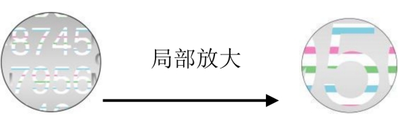 随机光刻多色数码。酒樽处可刮开,肉眼观察可见一组 16 位随机数码,每位数码内可见多色彩条。(使用放大镜效果更佳)。