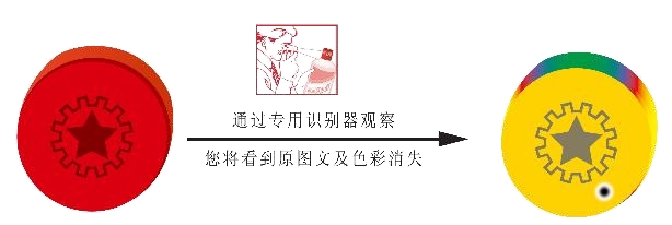 “飘点浮影”技术。肉眼观察帽套顶部,帽顶外观为亚光红色圆形,在圆形中央有亚光红色烫金图案。通过专用识别器观察,可见帽顶部呈亮黄色,上有黑色浮点,可随帽套的转动在亮黄色背景范围内漂移。