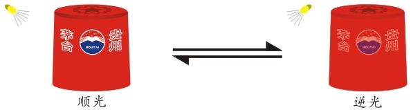 顺、逆光反射。手持茅台酒瓶直接肉眼观察防伪帽套:在顺光方向,茅台logo图文为明亮的珠光增强色。逆光方向,该图文色彩明显变淡。
