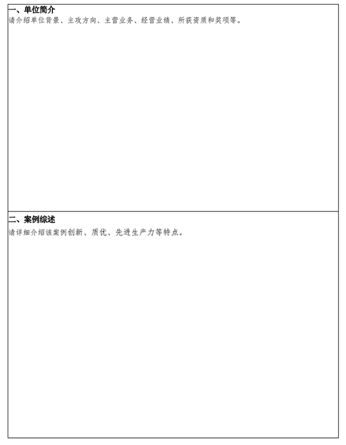 4、《2024新质生产力发展案例征集表》须按照表格进行填写,案例情况叙述准确、逻辑性强、充分展现“创新”、“质优”、“先进生产力”的特点(单篇案例字数1500-2000字,文字、图片结合);