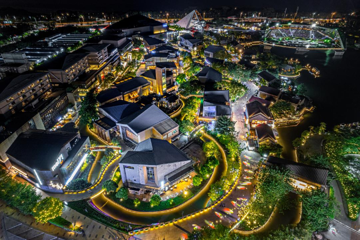此外,作为滨海休闲娱乐地标性项目,深圳欢乐海岸也彰显了岭南文化与现代美学集于一体的在地风貌。坐落其中的曲水湾建筑多以灰色调青砖、竹木建材为主,搭配户外摆放空间和蜿蜒水道,形成“临水而居”的景象。整片区域通过水系和景观桥连接互通,形成了“小桥流水、绿树成荫”的岭南诗意画卷。OCT创意展示中心则以超现实主义的设计风格成为欢乐海岸的现代艺术象征,其形似水滴的流线型外观与自然光的互动,展现了建筑与自然和谐共生的理念。
