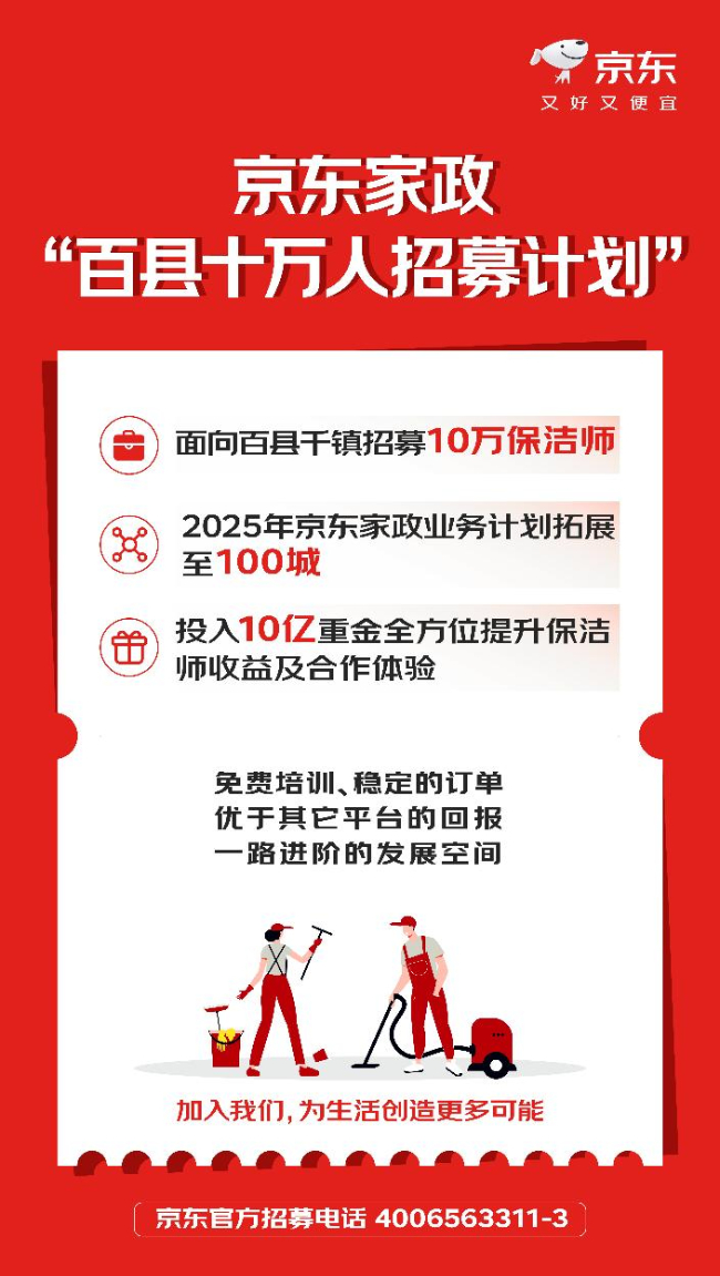 1月7日,京东家政开启“百县十万人招募计划”,面向百县千镇招募10万保洁师,2025年计划把服务覆盖区域拓展至100个城市,并投入10亿资金全方位提升保洁师收益及合作体验。为满足岁末骤增的家政服务需求,京东家政还投入千万资源保障春节服务供应,以现金激励等多重收益稳定服务供给。