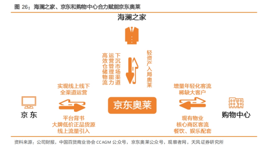 天风证券分析师孙海洋表示,FCC是阿迪达斯发展国内下沉市场的优选。借助海澜之家在国内广阔下沉市场多年积累的渠道网络,阿迪达斯可实现对于四五线城市需求的满足及市场份额的提升;同时,海澜之家也有望凭借阿迪达斯的品牌优势在运动市场获得进一步增长,并率先卡位折扣渠道。京东奥莱新业态不仅具备轻资产、下沉市场及数字化等发展特点,且汲取海澜之家的经营模式,整合了海澜之家、京东和购物中心的优势资源,有望在一众奥莱业态中脱颖而出。