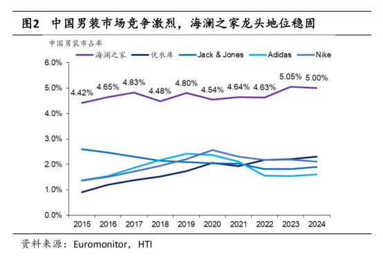 公司财报数据显示,海澜之家主品牌实现主营业务收入46.42亿元。另外根据欧睿国际数据显示,自2014年以来,海澜之家在中国男装行业中,市场占有率连续11年保持第一(2024年为5.0%)。