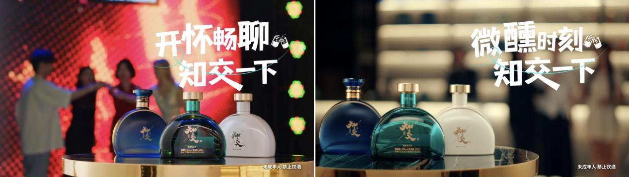 夜聊场景凸显知交酒在社交互动中的情感价值,成为友谊交流的纽带;调酒场景聚焦创意饮用方式,知交酒新中式调酒的巧妙搭配,为消费者提供个性化的饮用体验;