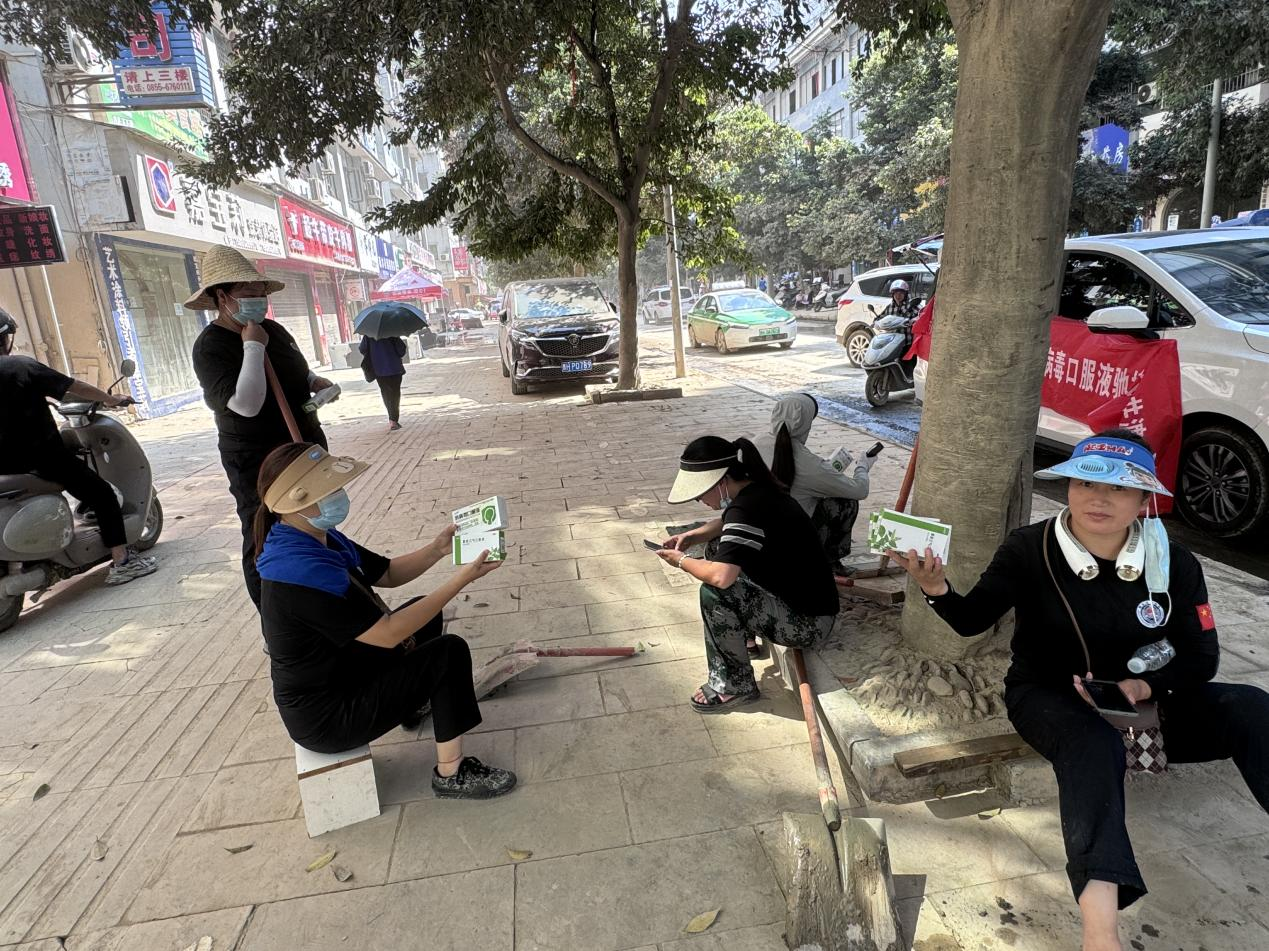 卫生防疫是灾后工作的重点。洪水过后,温度回升,天气多变,各类传染病易高发,抗菌消炎、防暑类药品是灾区群众亟需的医疗资源。7月7日,药师帮捐赠药品进行全城派发。城区现场天气炎热,腐烂味较大,为了更快速的将药品物资派送至群众手中,药师帮工作人员将部分药品运送至药店,借助药店拆零覆盖周边居民。