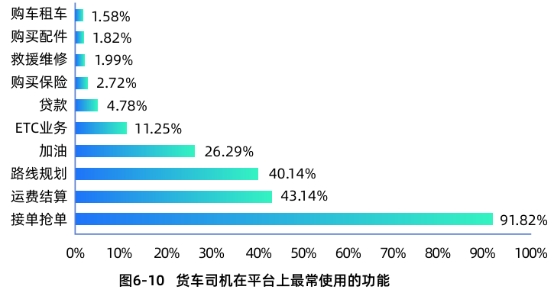调查显示,91.82%的司机使用平台接单抢单,43.14%使用其运费结算功能,40.14%使用路径导航功能,此外超过25%的司机使用加油服务。