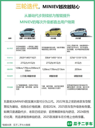 瓜子二手车的报告显示,五菱宏光MINIEV可分为三个主要代际版本,每一代产品都在空间、续航和配置上进行了针对性优化,形成清晰的价格层次,满足不同预算用户的购车需求。