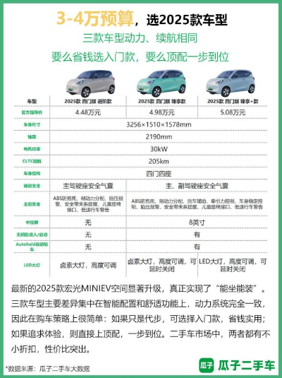 早期的2022款及之前车型功能基础,但价格优势明显,最低价已降至1万元出头;2024款在续航、安全配置上全面升级,是“实用与性价比”的平衡之选;最新的2025款则在空间布局、智能体验上实现突破,成为3万至4万元区间消费者的理想选择。