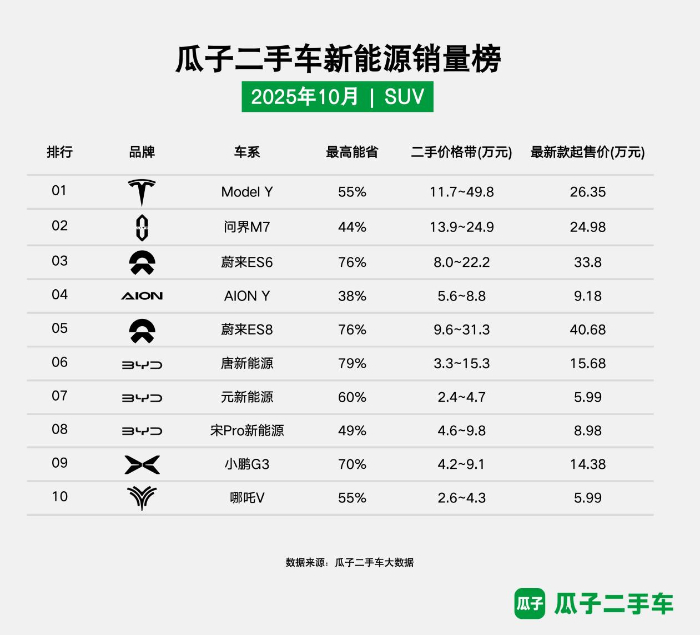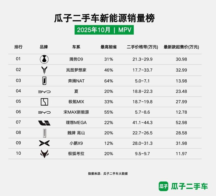 瓜子二手车平台近日发布了2025年10月新能源汽车销量榜,该榜单基于平台真实交易数据,客观反映了当前二手新能源汽车市场的消费偏好与价格走势,展现出各细分市场格局呈现多元化发展态势。