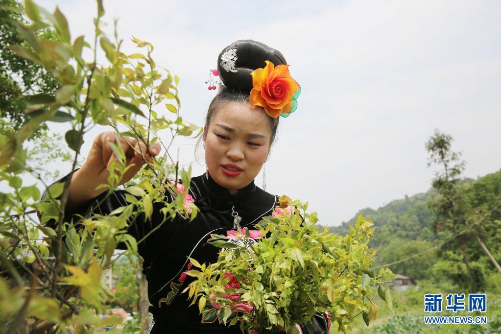 4月23日,台江县的苗家妇女在采摘用来制作五彩饭的树叶。 新华社发(余天英 摄)