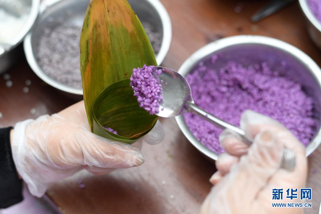 4月24日,在台江县姊妹街,苗家妇女沿街制作五彩粽。 当日,在贵州省黔东南苗族侗族自治州台江县姊妹街,当地苗家妇女沿街手工制作五彩粽、五彩饭,喜迎“姊妹节”,吸引不少游客驻足观赏。五彩粽、五彩饭是当地苗族同胞使用不同树叶、花朵制成的天然染料,浸泡糯米蒸制而成。 新华社记者 杨楹 摄