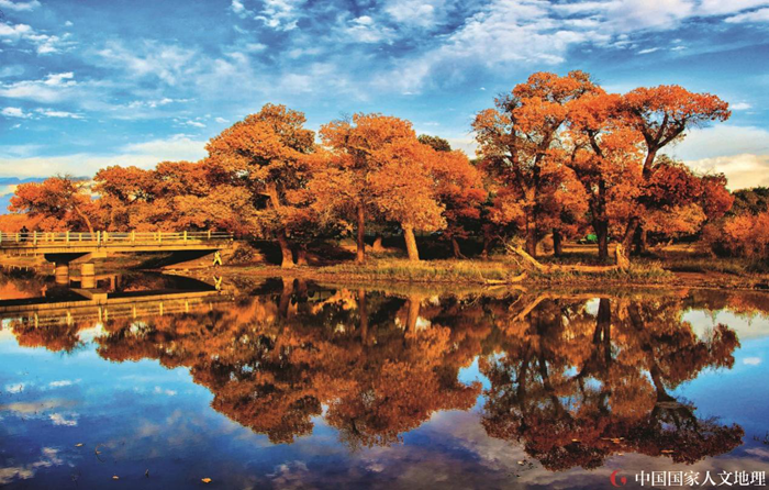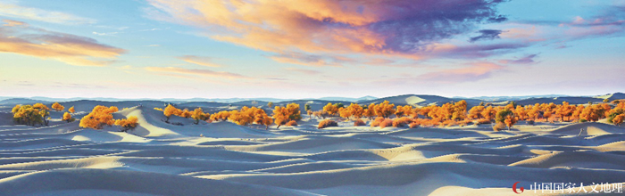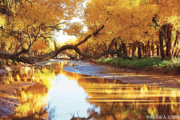 每年秋季,额济纳胡杨林由嫩绿变为金黄、橘黄,直至火红一片,层林尽染,游人如织。漫步胡杨林中,欣赏灿烂绚丽的树叶,倾听风吹枝摆的声响,宛如潜身于金色海洋。如诗如画的景色,令摄影家和观光客久久不愿离开。额济纳金秋胡杨胜景,也受到知名导演的青睐。张艺谋执导的电影《英雄》中,不知有多少人沉醉于章子怡与张曼玉在胡杨林中的刀光剑影,也让这片充满色彩与韧性的绝美之地为世界所知。