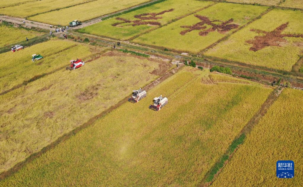 9月22日,在湖南省衡阳市衡阳县库宗桥镇,农机手驾驶农机收割稻谷(无人机照片)。 9月23日是“中国农民丰收节”,在湖南省衡阳市各乡村,农民忙着收获水稻、蔬菜、瓜果等农作物,处处呈现一派丰收景象。 新华社记者 赵众志 摄