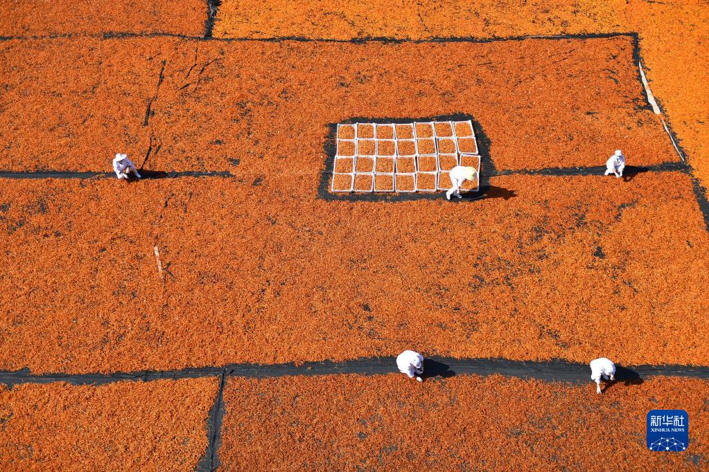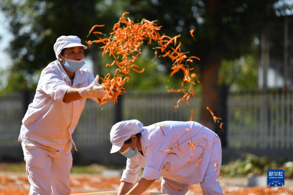 9月22日,在湖南省衡阳市衡东县吴集镇,人们在晾晒辣椒。 新华社记者 赵众志 摄