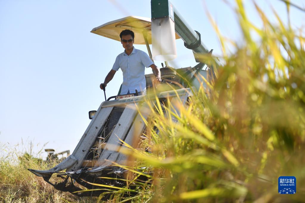 9月22日,在湖南省衡阳市衡阳县库宗桥镇,农机手驾驶农机收割稻谷。 新华社记者 赵众志 摄