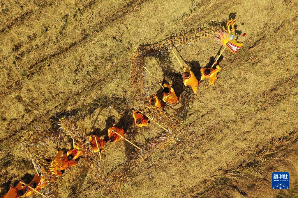 9月22日,在湖南省衡阳市衡阳县库宗桥镇,农民舞“稻草龙”庆贺丰收(无人机照片)。 新华社记者 赵众志 摄