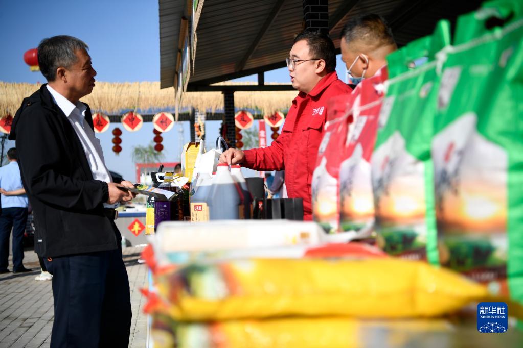 9月23日,参观者在宁夏石嘴山市平罗县举办的中国农民丰收节活动上了解现场展出的农产品。 新华社记者 王鹏 摄