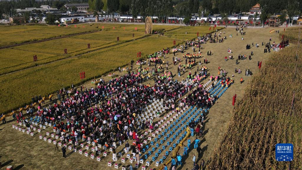 9月23日,宁夏青铜峡市韦桥村中国农民丰收节活动在田野间举行(无人机照片)。 新华社记者 王鹏 摄