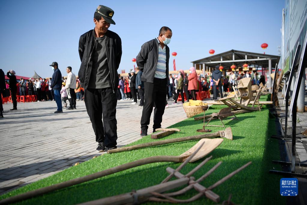 9月23日,农民在宁夏石嘴山市平罗县举办的中国农民丰收节活动上观看农耕文化展。 新华社记者 王鹏 摄