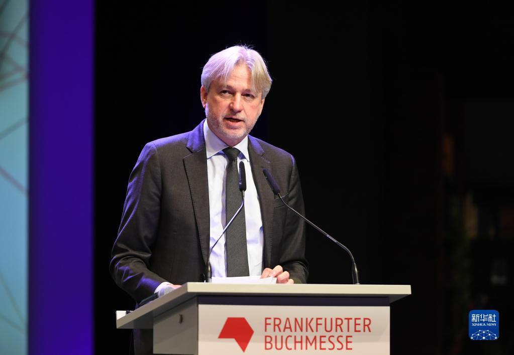 10月19日,法兰克福书展主席于尔根·博斯在德国法兰克福举行的记者会上讲话。 新华社记者 逯阳 摄