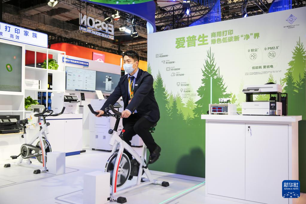 在第四届进博会技术装备展区爱普生展台,工作人员展示借助骑行产生的能量,让应用了冷印技术的喷墨打印机工作。 新华社发