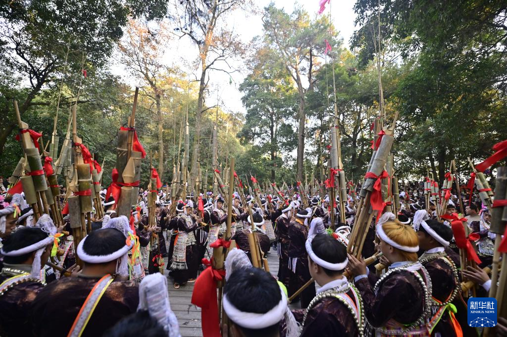 12月22日,从江县丙妹镇岜沙苗寨芦笙手在吹奏芦笙。 新华社发(吴德军 摄)