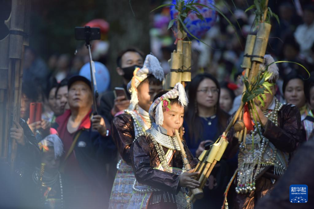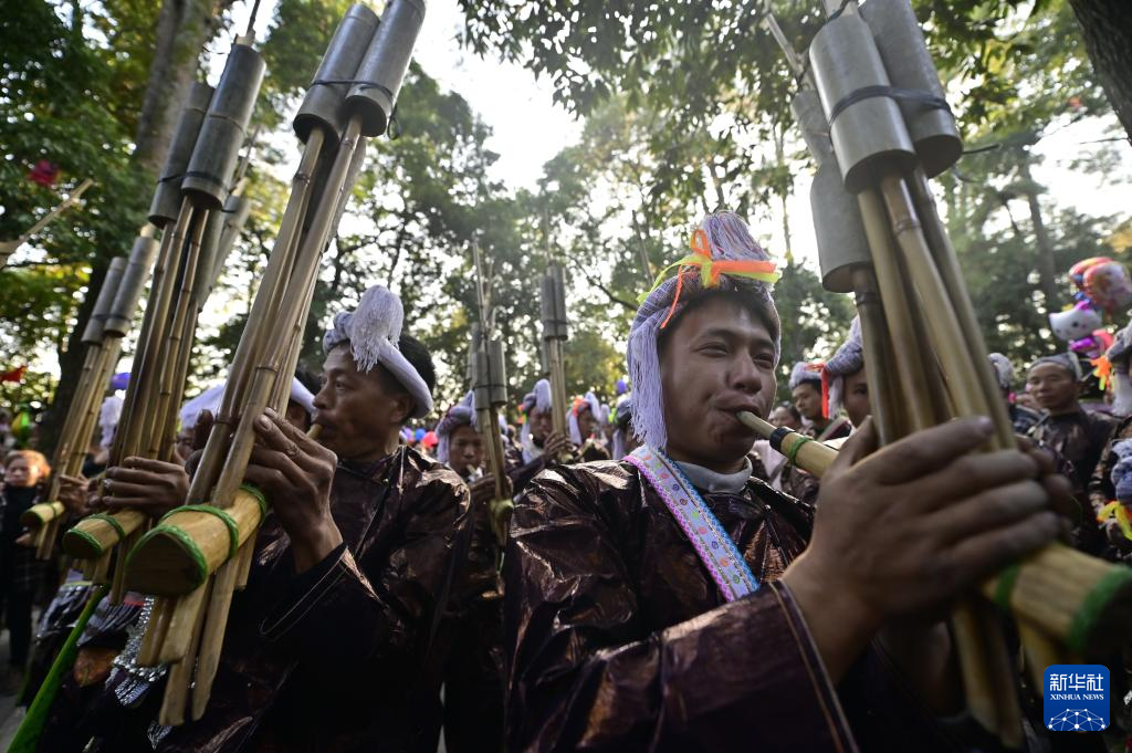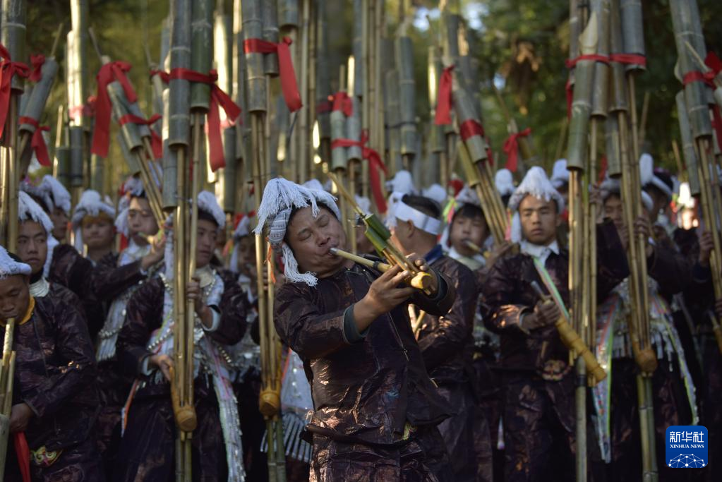 12月22日,从江县丙妹镇岜沙苗寨芦笙手在吹奏芦笙。 当日,贵州省黔东南苗族侗族自治州从江县丙妹镇岜沙苗寨迎来一年一度的传统芦笙节,村民载歌载舞,庆祝丰收,祈福来年风调雨顺。 新华社发(吴德军 摄)