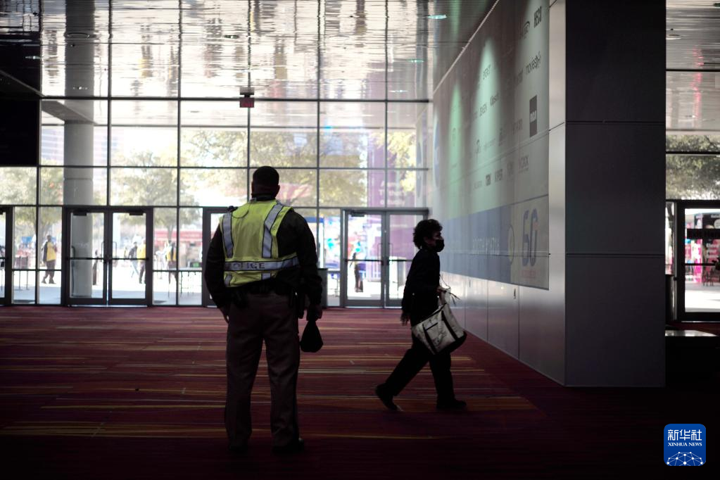 1月4日,在美国拉斯维加斯,安保人员(左)在会展中心执勤。 新华社记者 吴晓凌 摄