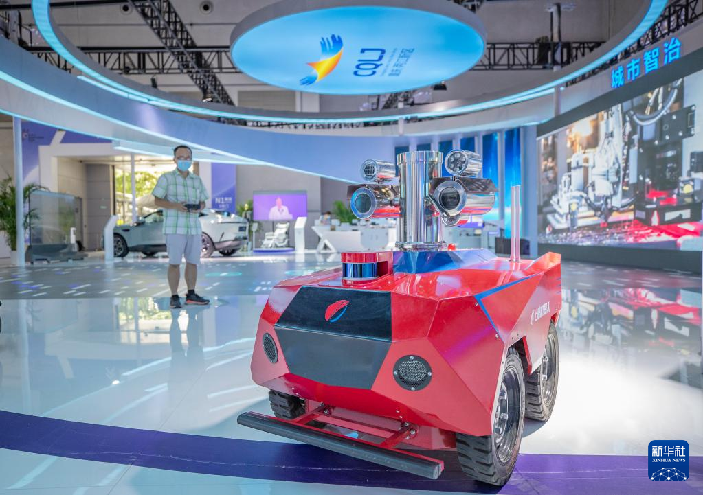 8月21日,工作人员在2022智博会重庆两江新区展厅内演示防爆化工巡检机器人。