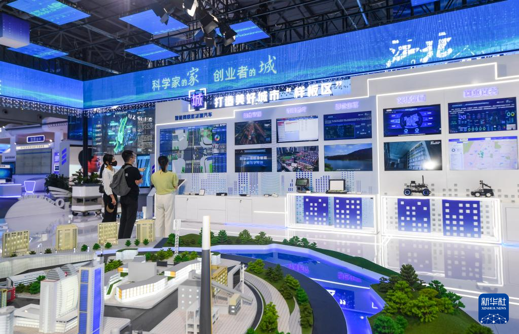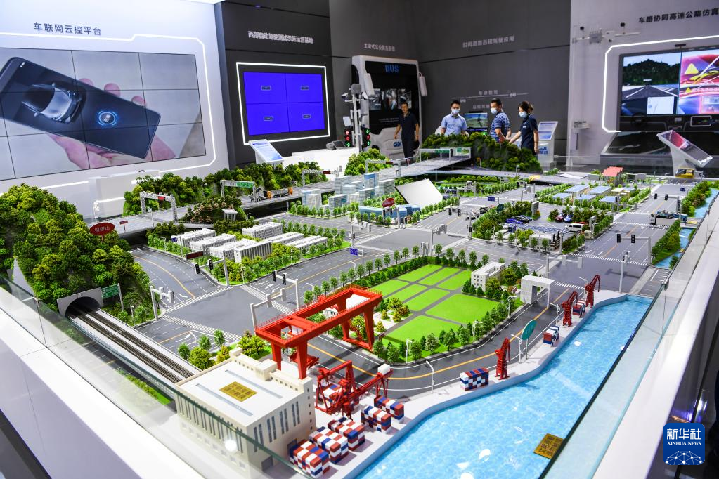 8月21日,嘉宾在2022中国国际智能产业博览会会场上参观车路协同沙盘。