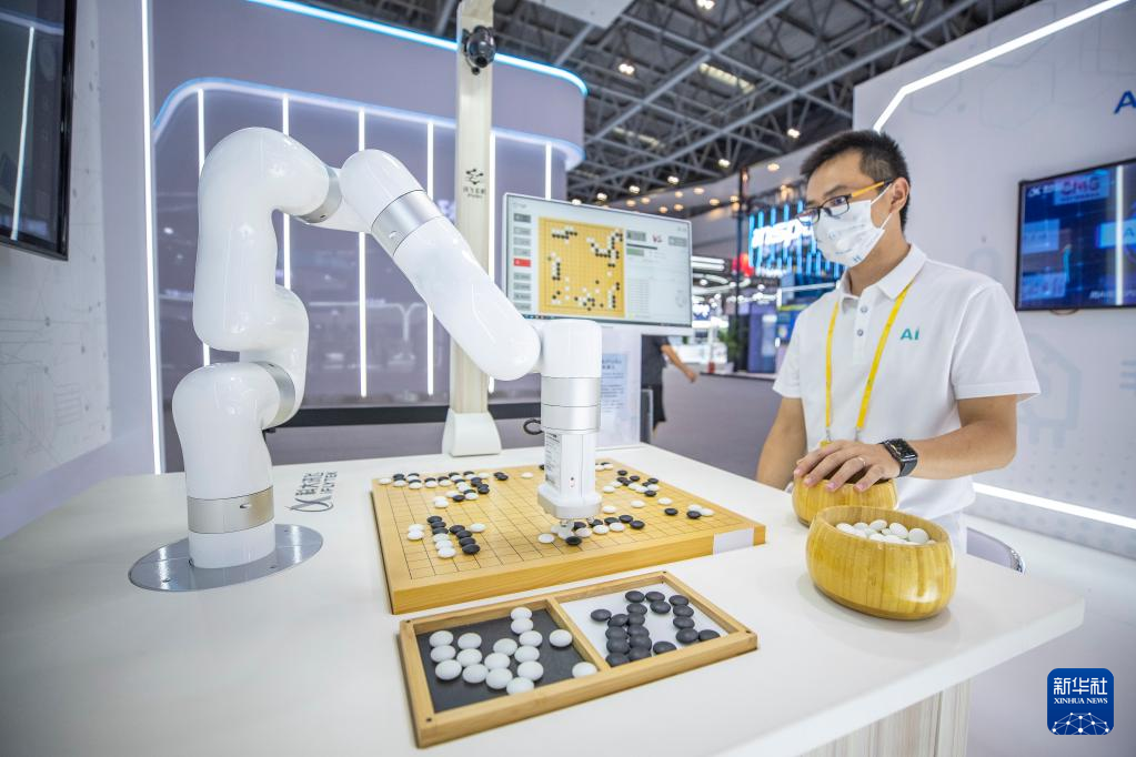 8月21日,2022智博会科大讯飞展厅的工作人员演示与弈棋机器人对弈。