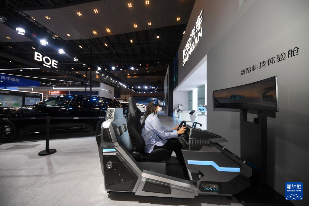 8月21日,工作人员在2022智博会重庆渝中展厅内演示F1电竞模拟器。