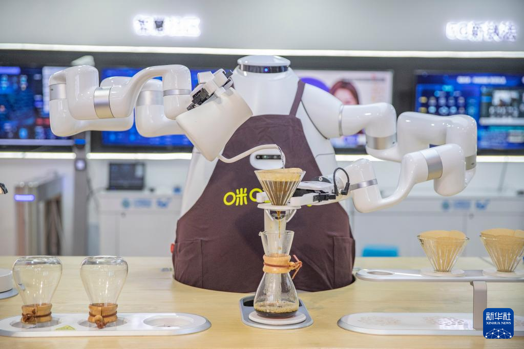 8月21日,在2022智博会中国移动展厅内,智能机器人在制作咖啡。