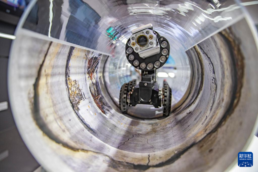这是8月21日在2022智博会中央大厅重庆展馆内拍摄的非开挖管道检测机器人。