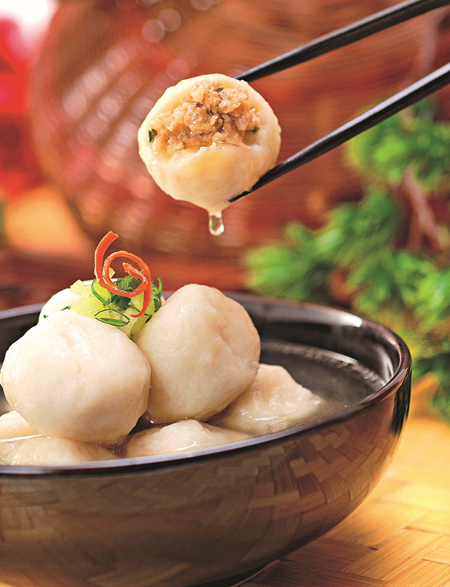 福州鱼丸是用鳗鱼肉、马鲛鱼肉等剁成肉末,加番薯粉搅拌均匀,再包以猪瘦肉或虾等馅料而制成的丸状食物。由于选料精细,制作考究,皮薄均匀,色泽洁白晶亮,食之滑润清脆,汤汁荤香不腻,有特殊的海鲜风味,福州鱼丸因此成为深受大众喜爱的营养美食。