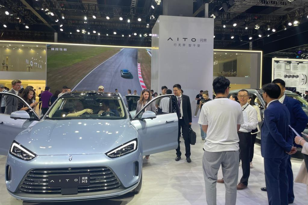 AITO问界M5在展台上吸引了很多观展者的目光。新华社记者王辰阳 摄