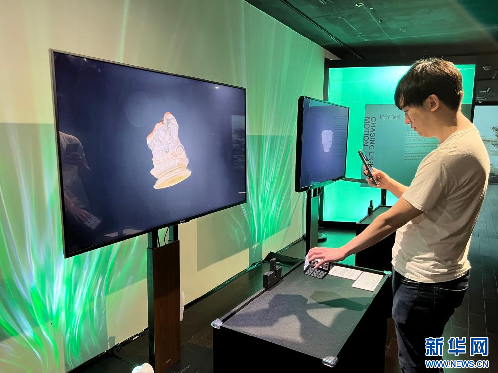 你想象过将翠玉白菜、肉形石拿在手里细细观赏吗?在“捕光捉影”单元,借助一个小小的立方体感测器即可实现。通过数字装置,观众手中的立方体化身眼前屏幕中的3D文物模型,随着手腕转动,文物360度的样貌也一一呈现。